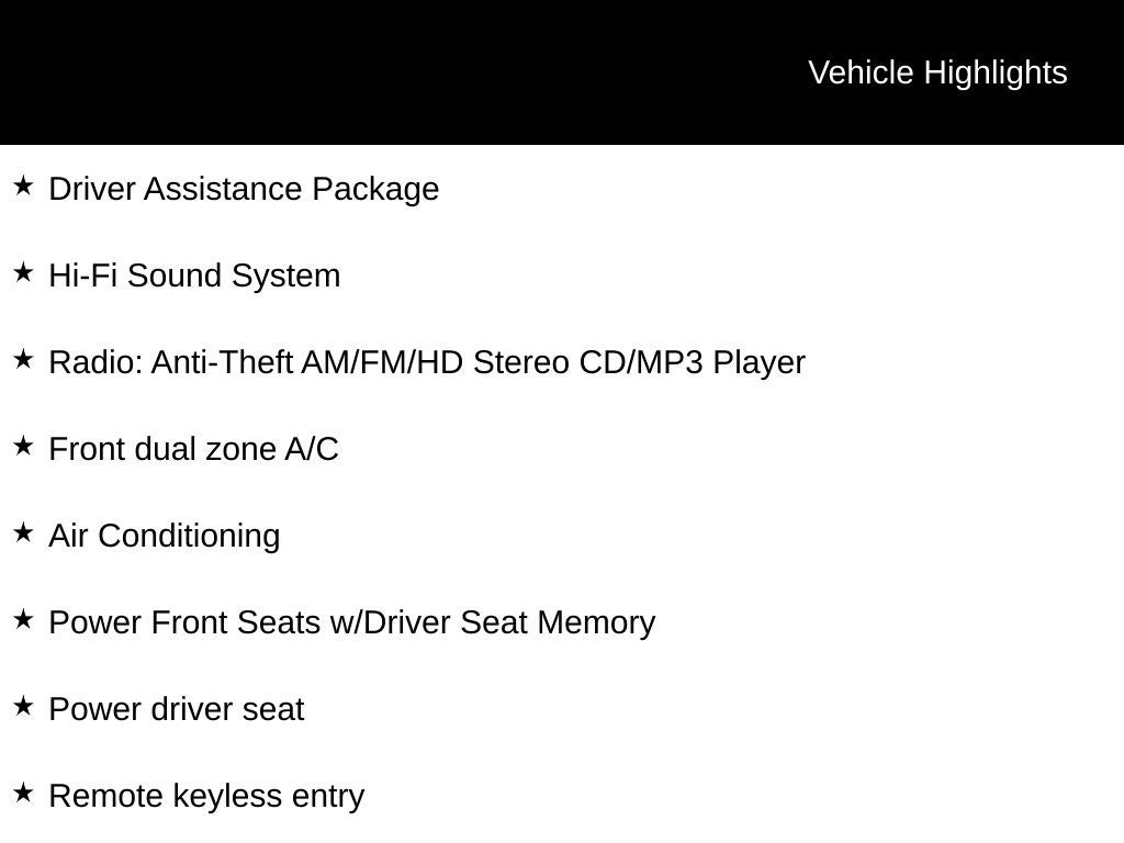 - Radio: Anti-Theft AM/FM/HD Stereo CD/MP3 Player