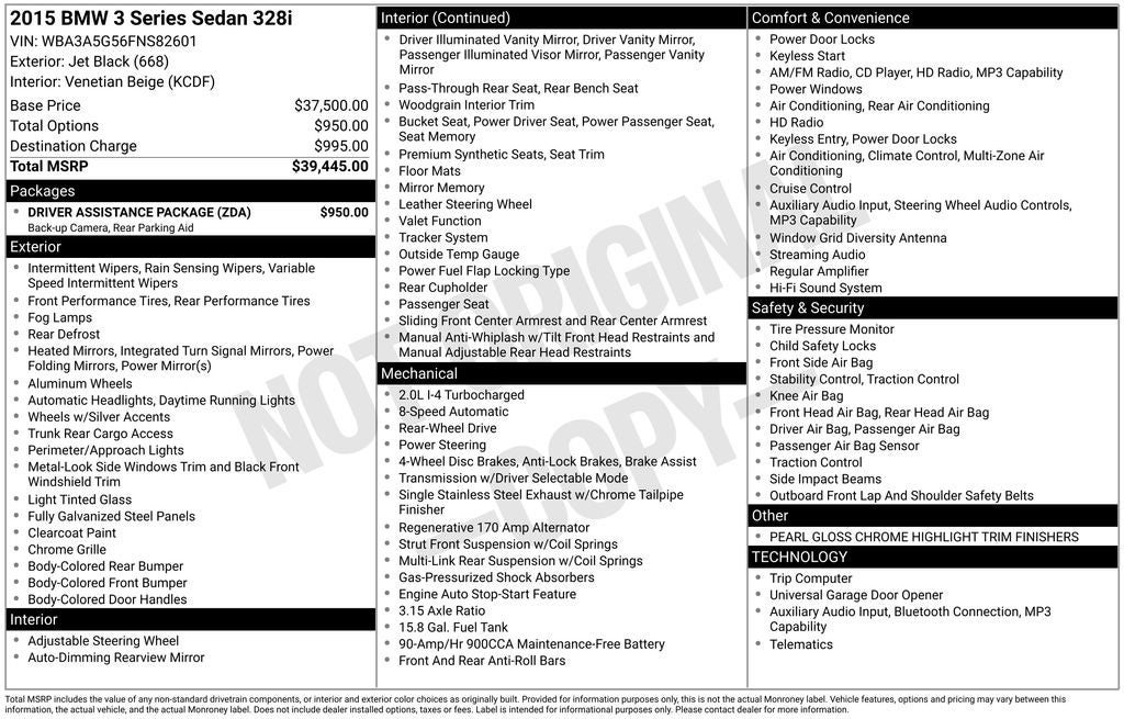 2015 BMW 3 Series Jet Black 328i RWD 8-Speed Automatic 2.0L 4-Cylinder DOHC 16V Turbocharged Air Conditioning, Driver Assistance Package, Emergency communication system: BMW Assist eCall, Front Bucket Seats, Front dual zone A/C, Front fog lights, Hands-Free Bluetooth® & USB Audio Connection, Hi-Fi Sound System, Luxury Line Aesthetic Elements, Memory seat, Park Distance Control, Pearl Gloss Chrome Highlight Trim Finishers, Power driver seat, Power Front Seats w/Driver Seat Memory, Power passenger seat, Radio: Anti-Theft AM/FM/HD Stereo CD/MP3 Player, Rear-View Camera, Remote keyless entry, SensaTec Leatherette Upholstery, Speed control, Turn signal indicator mirrors, Wheels: 17 x 7.5 Lt Alloy Star-Spoke (Style 393).