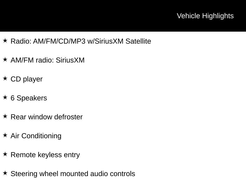 - Radio: AM/FM/CD/MP3 w/SiriusXM Satellite -inc: 6 speakers and iPod/USB auxiliary input jacks