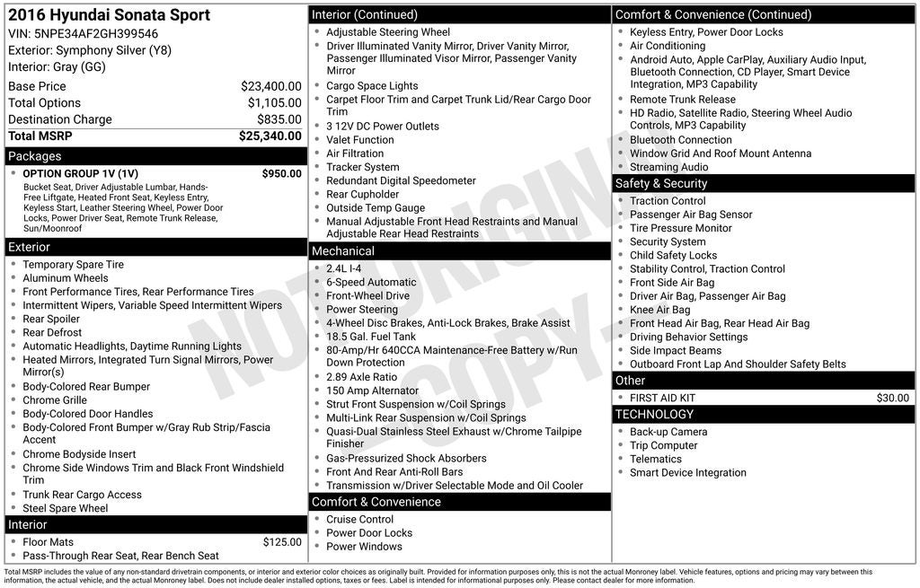 This online window sticker is provided for informational purposes only. Vehicle features, options, pricing and other information are subject to change. See your Hyundai dealer and the Monroney label affixed to the actual vehicle for the most up-to-date specifications and information.