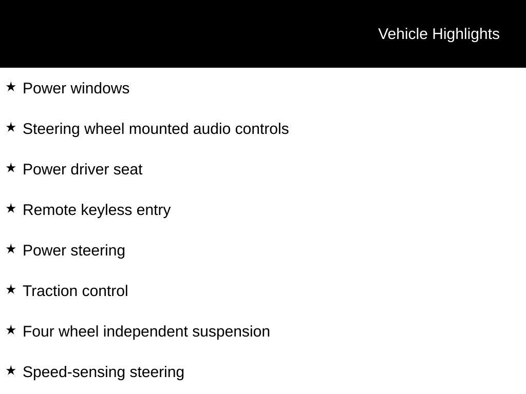 - Front Bucket Seats -inc: 10-way power driver's seat w/2-way power lumbar support, 6-way manual passenger seat w/height adjust, seatback pockets and energy absorbing front seats