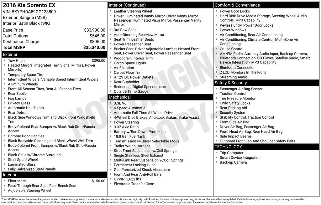 Sangria 2016 Kia Sorento EX AWD 6-Speed Automatic with Sportmatic 3.3L DOHC AWD, 3rd row seats: split-bench, Exterior Parking Camera Rear, Front dual zone A/C, Front fog lights, Heated Front Bucket Seats, Leather Seat Trim, Power driver seat, Power passenger seat, Radio: AM/FM/CD/MP3/SiriusXM, Rear air conditioning, Rear Parking Sensors, Tow Hitch, UVO eServices, Wheels: 18 x 7.5 Alloy.
