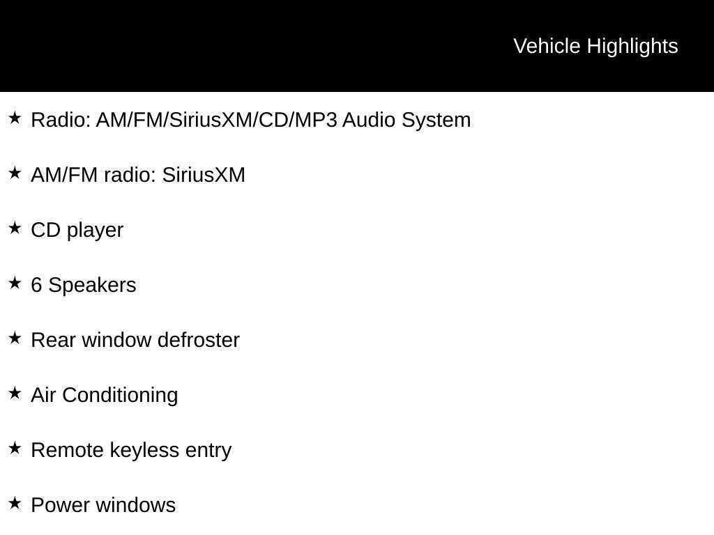 - Radio: AM/FM/SiriusXM/CD/MP3 Audio System -inc: 3.5-inch display, 6 speakers and USB input