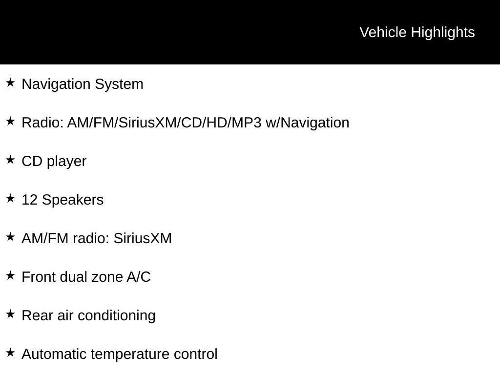 - Radio: AM/FM/SiriusXM/CD/HD/MP3 w/Navigation -inc: Infinity premium audio w/12 speakers, SiriusXM radio free activation and 3-month trial subscription, QuantumLogic Surround, Clari-Fi music restoration technology, Blue Link telematics, iPod/USB/auxiliary jacks, 8" touchscreen navigation display w/Android Auto and rearview camera