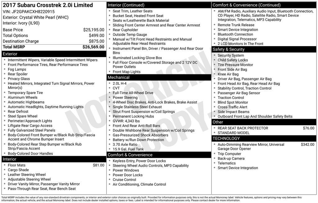 ** 1 OWNER ** 2017 Subaru Crosstrek Crystal White Pearl 2.0i Limited AWD Lineartronic CVT 2.0L 16V DOHC 6 Speakers, Active Cruise Control, All Weather Floor Mats, Alloy wheels, Auto-Dimming Mirror w/Compass & HomeLink, Automatic temperature control, Driver vanity mirror, Exterior Parking Camera Rear, Front anti-roll bar, Front fog lights, Fully automatic headlights, Heated Front Bucket Seats, Knee airbag, Leather Shift Knob, Leather-Trimmed Upholstery, Outside temperature display, Panic alarm, Passenger vanity mirror, Radio: Subaru Starlink 7.0 Multimedia Plus System, Rear anti-roll bar, Rear window wiper, Remote keyless entry, Security system, Steering wheel mounted audio controls, Subaru Starlink Smartphone Integration, Telescoping steering wheel, Turn signal indicator mirrors, Variably intermittent wipers.