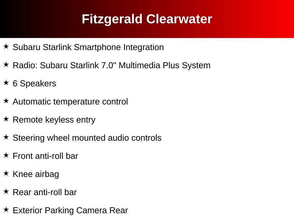 - Radio: Subaru Starlink 7.0" Multimedia Plus System -inc: AM/FM stereo HD Radio, multi touch gesture high resolution 7.0" LCD display, voice activated controls, Radio Broadcast Data System (RBDS), Bluetooth® audio streaming connectivity, Bluetooth® hands-free phone and text messaging connectivity, iPod control capability, SMS text messaging capability, SiriusXM All Access Radio, Travel and Travel Link (subscription required), dual USB ports, 3.5mm auxiliary input jack, 6 speakers, and roof mounted audio and satellite antenna StarLink enrollment cannot be applicable to Fleet Management Companies (FMCs) or to Commercial fleet accounts at this time.