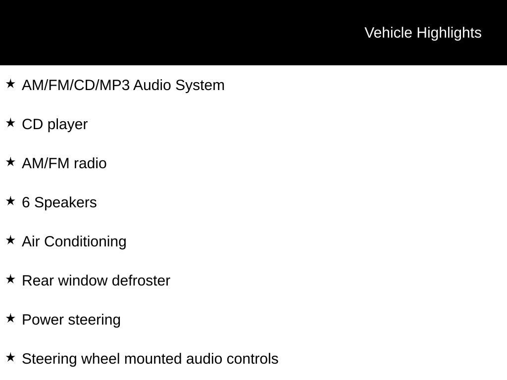 - Radio w/Seek-Scan, Clock, Speed Compensated Volume Control and Steering Wheel Controls
