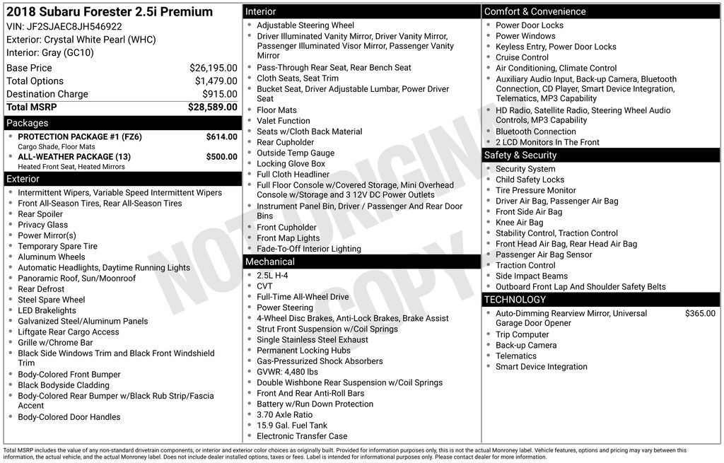 ** ONE OWNER ** 2018 Subaru Forester Crystal White Pearl 2.5i Premium AWD Lineartronic CVT 2.5L 4-Cylinder DOHC 16V VVT Air Conditioning, All-Weather Floor Mats, Auto-Dimming Mirror w/Compass & HomeLink, Cargo Cover - Manual Rear Gate, Emergency communication system: STARLINK, Exterior Parking Camera Rear, Outside temperature display, Power driver seat, Power moonroof, Protection Package #1, Radio: Subaru Starlink 7.0 Multimedia Plus System, Rear Seatback Protector, Speed control, Splash Guards.