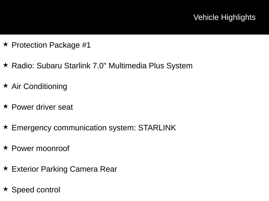 - Radio: Subaru Starlink 7.0" Multimedia Plus System -inc: AM/FM stereo HD Radio w/single-disc CD player w/MP3/WMA/CRR/RW file capability, multi touch gesture high resolution display, 7.0" LCD screen, voice activated controls, Bluetooth® audio streaming connectivity, Bluetooth® hands-free phone connectivity, Bluetooth® hands-free text messaging connectivity, iPod control capability, rear-vision camera, SiriusXM All Access radio (subscription required), SiriusXM Travel Link (subscription required), smartphone integration: AHA, MirrorLink, Pandora and Siri Eyes Free, Starlink cloud applications: refer to subaru.com for app availability, dual USB ports, 3.5mm auxiliary input jack, 6 speakers, body color roof mounted audio, satellite and connected services antenna and Subaru Starlink connected services StarLink enrollment cannot be applicable to Fleet Management Companies (FMCs) or to Commercial fleet accounts at this time.