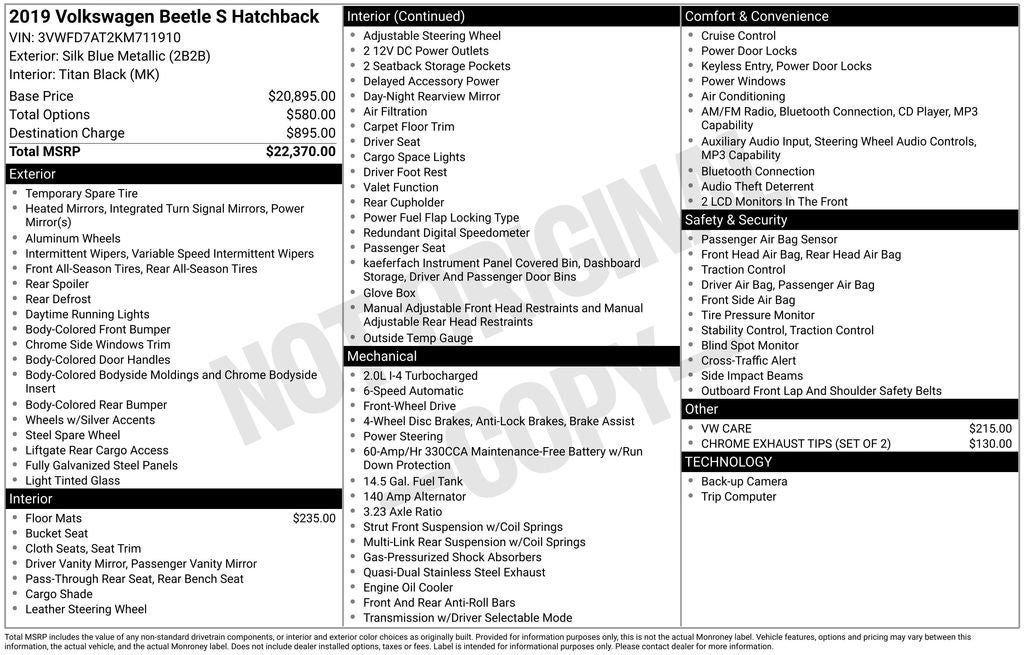 2019 Volkswagen Beetle Blue Metallic 2.0T S FWD 6-Speed Automatic with Tiptronic 2.0L TSI Black Cloth, 16 10-Spoke Alloy Wheels, 4-Wheel Disc Brakes, 8 Speakers, ABS brakes, Air Conditioning, Alloy wheels, AM/FM radio, Bodyside moldings, Brake assist, Bumpers: body-color, CD player, Chrome Exhaust Tips (Set of 2), Driver door bin, Driver vanity mirror, Dual front impact airbags, Dual front side impact airbags, Electronic Stability Control, Exterior Parking Camera Rear, Four wheel independent suspension, Front anti-roll bar, Front Bucket Seats, Front Center Armrest w/Storage, Front reading lights, Front Seats, Heated door mirrors, Illuminated entry, Leather Shift Knob, Leather steering wheel, Low tire pressure warning, Monster Mats w/Logo Rubber Mat Kit, Occupant sensing airbag, Outside temperature display, Overhead airbag, Overhead console, Panic alarm, Passenger door bin, Passenger vanity mirror, Power door mirrors, Power steering, Power windows, Radio data system, Radio: AM/FM 5 Touchscreen w/CD Player, Rear anti-roll bar, Rear reading lights, Rear window defroster, Remote keyless entry, Speed control, Speed-sensing steering, Split folding rear seat, Spoiler, Steering wheel mounted audio controls, Tachometer, Telescoping steering wheel, Tilt steering wheel, Tixo Cloth Seating Surfaces, Traction control, Trip computer, Turn signal indicator mirrors, Variably intermittent wipers, VW Care.