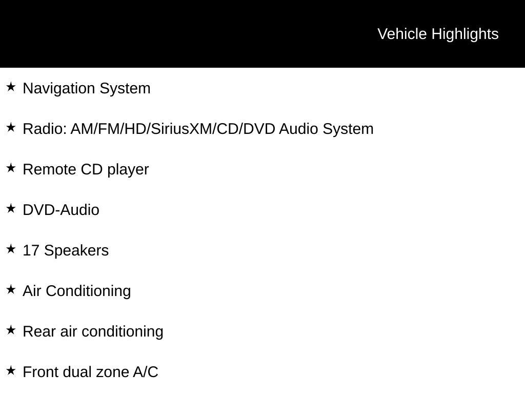 - Radio: AM/FM/HD/SiriusXM/CD/DVD Audio System -inc: Lexicon Quantum Logic Surround (QLS) sound system w/17 speakers, Clari-Fi music restoration technology, 12.3" HD navigation system w/DIS multimedia controller, wireless device charging front, 1 front data/charge and 1 rear charge only USB ports, Bluetooth® hands-free phone system w/audio streaming and rear seat entertainment system w/dual 10.3" HD displays