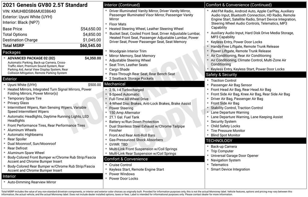 *** ONE OWNER ** 2021 Genesis GV80 Uyuni White 2.5T AWD 8-Speed Automatic 2.5L DOHC 12 Speakers, Advanced Package 02, Air Conditioning, Android Auto & Apple CarPlay, Auto tilt-away steering wheel, Auto-dimming door mirrors, Auto-dimming Rear-View mirror, Auto-leveling suspension, Blind-Spot View Monitor, Delay-off headlights, Emergency communication system: Genesis Connected Services, Exterior Parking Camera Rear, Front Bucket Seats, Front dual zone A/C, Heated & Ventilated Front Bucket Seats, Leather Seating Surfaces, Leatherette Seating Surfaces, Lexicon Premium Audio w/21-Speakers, Low tire pressure warning, Memory seat, Navigation System, Option Group 02, Outside temperature display, Power driver seat, Power Liftgate, Power moonroof, Radio: AM/FM/SiriusXM/HD Premium Audio System, Rear air conditioning, Rear Parking Collision-Avoidance Assist, Remote Smart Parking Assist, Speed control, Steering wheel memory, Surround View Monitor, Wheels: 20 x 8.5J Alloy.