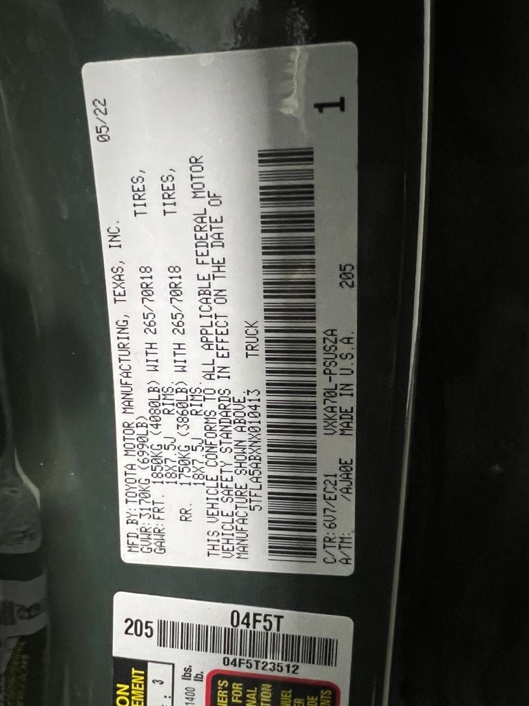 ** ONE OWNER **CLEAN CARFAX**FLORIDA TRUCK**LEATHER**TRD OFF ROAD PACKAGE**ADVANCED OFFROAD TECHNOLOGY PACKAGE**PREMIUM AUDIO PACKAGE** Army Green 2022 Toyota Tundra SR5 RWD 10-Speed Automatic 3.4L V6 Black w/SofTex Seat Trim, 18 x 8 Alloy Wheels, 32 Gallon Fuel Tank, 400W/120V AC Deck & Cabin Power Supply, Advanced Off-Road Technology Package, Air Conditioning, Apple CarPlay/Android Auto, Bedside TRD Off Road Decal, Black Grille w/Chrome Surround, Blind Spot Monitor w/Lane Change Assist, Exterior Parking Camera Rear, Front & Rear Mud Guards, Front fog lights, Front Spoiler Delete, Heated Front Bucket Seats, Heated Leather Steering Wheel, Multi-Terrain Back Monitor, Panoramic View Back Monitor, Parking Support Alert/Brake, Radio: Premium Audio, SofTex Seat Trim, Speed control, Steering wheel mounted audio controls, Towing Package, TRD Off-Road Premium Package, TRD Off-Road Suspension w/Bilstein Shocks.