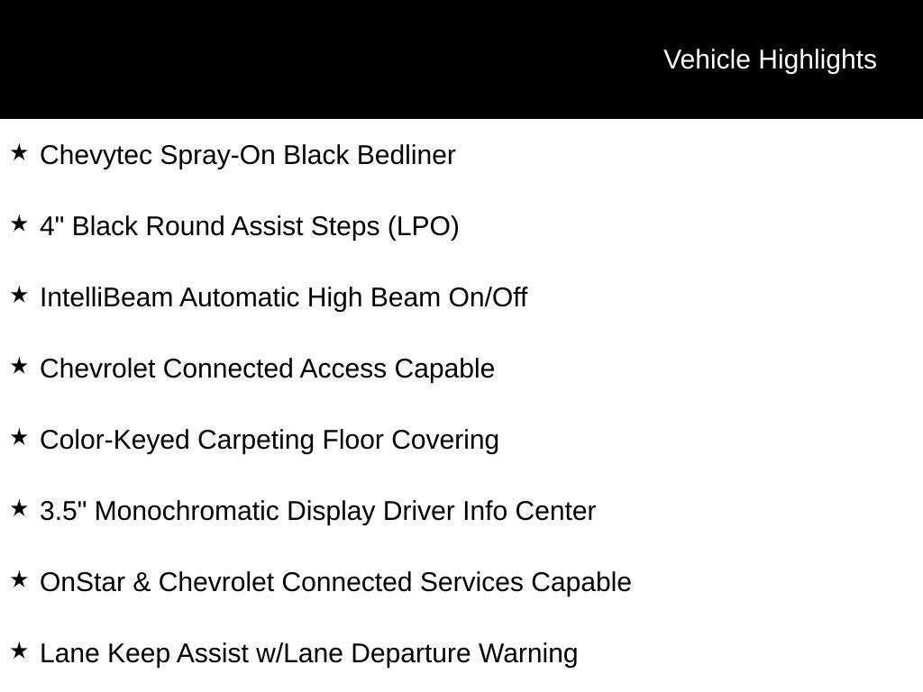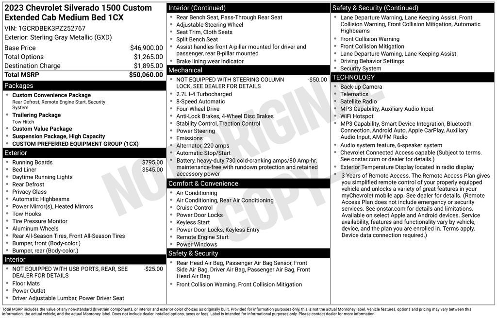 - Custom Convenience Package includes (BTV) Remote Start with (UTJ) content theft alarm, (C49) rear-window defogger, (UF2) bed LED cargo area lighting and (QT5) EZ Lift power lock and release tailgate (Included and only available with (PDX) Custom Value Package.)