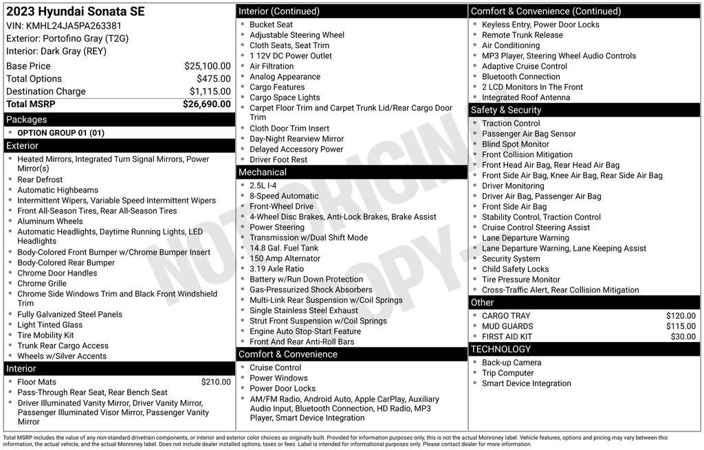 2023 Hyundai Sonata Portofino Gray SE FWD 8-Speed Automatic with SHIFTRONIC 2.5L I4 Dark Gray Cloth, 16 x 6.5J Aluminum Alloy Wheels, 4-Wheel Disc Brakes, 6 Speakers, ABS brakes, Air Conditioning, Alloy wheels, AM/FM radio, Apple CarPlay & Android Auto, Auto High-beam Headlights, Brake assist, Bumpers: body-color, Cargo Tray, Carpeted Floor Mats, Delay-off headlights, Driver door bin, Driver vanity mirror, Dual front impact airbags, Dual front side impact airbags, Electronic Stability Control, Exterior Parking Camera Rear, First Aid Kit, Four wheel independent suspension, Front anti-roll bar, Front Bucket Seats, Front Center Armrest, Front reading lights, Fully automatic headlights, Heated door mirrors, Illuminated entry, Knee airbag, Low tire pressure warning, Mud Guards, Occupant sensing airbag, Option Group 01, Outside temperature display, Overhead airbag, Overhead console, Panic alarm, Passenger door bin, Passenger vanity mirror, Power door mirrors, Power steering, Power windows, Premium Cloth Seating Surfaces, Radio data system, Radio: AM/FM/MP3/HD Display Audio, Rear anti-roll bar, Rear side impact airbag, Rear window defroster, Remote keyless entry, Security system, Speed control, Speed-sensing steering, Speed-Sensitive Wipers, Split folding rear seat, Steering wheel mounted audio controls, Tachometer, Telescoping steering wheel, Tilt steering wheel, Traction control, Trip computer, Turn signal indicator mirrors, Variably intermittent wipers.
