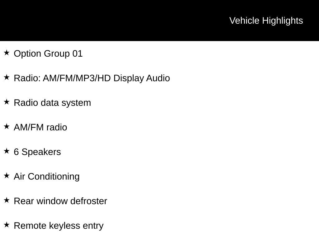 - Radio: AM/FM/MP3/HD Display Audio -inc: 8" color touchscreen, 6 speakers (2 front door mounted speakers, 2 tweeters and 2 rear speakers), integrated Bluetooth®, Apple CarPlay, Android Auto and USB