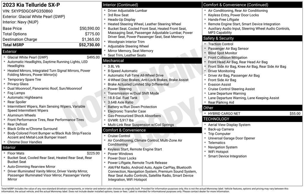 ** ONE OWNER ** 2023 Kia Telluride Glacial White Pearl SX-Prestige AWD 8-Speed Automatic 3.8L V6 DGI DOHC Dual CVVT SUNROOF / MOONROOF, 10 Speakers, 3.648 Axle Ratio, 3rd row seats: split-bench, 4-Wheel Disc Brakes, ABS brakes, Air Conditioning, Alloy wheels, AM/FM radio: SiriusXM, Apple CarPlay & Android Auto, Auto High-beam Headlights, Auto-dimming Rear-View mirror, Automatic temperature control, Brake assist, Bumpers: body-color, Carpet Floor Mats, Compass, Delay-off headlights, Driver door bin, Driver vanity mirror, Dual front impact airbags, Dual front side impact airbags, Electronic Stability Control, Emergency communication system: 911 Connect, Exterior Parking Camera Rear, Four wheel independent suspension, Front anti-roll bar, Front Bucket Seats, Front Center Armrest, Front dual zone A/C, Front fog lights, Front reading lights, Fully automatic headlights, Garage door transmitter: HomeLink, harman/kardon® Speakers, Heads-Up Display, Heated & Ventilated Front Bucket Seats, Heated door mirrors, Heated front seats, Heated rear seats, Heated steering wheel, Hybrid Cargo Net, Illuminated entry, Knee airbag, Leather Shift Knob, Leather steering wheel, Low tire pressure warning, Memory seat, Navigation System, Occupant sensing airbag, Outside temperature display, Overhead airbag, Overhead console, Panic alarm, Passenger door bin, Passenger vanity mirror, Power door mirrors, Power driver seat, Power Liftgate, Power moonroof, Power passenger seat, Power steering, Power windows, Premium Nappa Leather Seat Trim, Radio data system, Radio: AM/FM harman/kardon Audio System, Rain sensing wipers, Rear air conditioning, Rear anti-roll bar, Rear audio controls, Rear reading lights, Rear side impact airbag, Rear window defroster, Rear window wiper, Reclining 3rd row seat, Remote keyless entry, Roof rack: rails only, Security system, Smart Key w/ Push Button and Remote Start, Speed control, Speed-sensing steering, Split folding rear seat, Spoiler, Steering wheel mounted audio controls, Tachometer, Telescoping steering wheel, Tilt steering wheel, Traction control, Trip computer, Turn signal indicator mirrors, Variably intermittent wipers, Ventilated front seats, Ventilated rear seats, Wheels: 20 x 7.5 Black Finish.